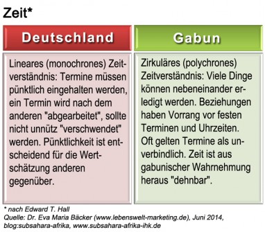 Es wird von Gabunern als unhöflich empfunden, wenn Deutsche direkt „zum Kern der Sache” kommen. Bei einer Geschäftsverhandlung sollte man sich erst einmal nach dem Befinden des Partners erkundigen und Smalltalk durchführen. Der Servicegedanke, wie er z.B. durch Schulungen im deutschen Geschäftsleben trainiert wird, ist unüblich in Gabun. Hier ist Durchsetzungsfähigkeit wichtig, z.B. bei Behördengängen. Die hierarchische Struktur in deutschen Unternehmen ist flacher als bei gabunischen. Hierarchie und Machtpositionen werden in der Regel nicht hinterfragt. Statussymbole, die mit einer hohen Position einhergehen, sind gängig und gelten als verdient. Selbst bei privat anstehenden Entscheidungen wird zunächst der Rat von Autoritätspersonen eingeholt, die bei der Meinungsbildung eine zentrale Rolle spielen. Widerspruch gegenüber höher Stehenden ist nicht üblich. Beim geschäftlichen Aufeinandertreffen kann es aus diesem Grunde schnell zu Missverständnissen kommen. Etwa wenn ein deutscher Experte, der nicht die Geschäftsführung inne hat, aber von seiner Firma mit Entscheidungsbefugnis ausgestattet ist, als Verhandlungspartner aufgrund seiner in den Augen der Gabuner geringeren Hierarchieposition abgelehnt wird.