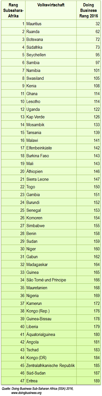 Mit Rang 32 bietet Mauritius die besten unternehmerischen Voraussetzungen südlich der Sahara, gefolgt von Ruanda auf Platz 62, Botswana (72) und Südafrika (73). Bemerkenswert ist, dass Ruanda weltweit auf Platz 2 bei der Einfachheit der Beschaffung von Krediten und auf Rang 12 bei der Unternehmensregistrierung liegt.