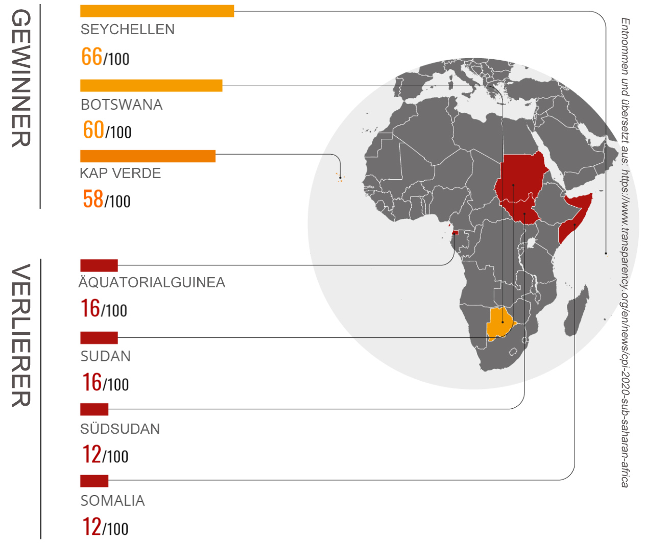 Details, Hintergründe und Perspektiven zur Korruption in Subsahara-Afrika bietet der aktuelle Bericht von Transparency International “Corruption Perceptions Index 2020“ auf den Seiten 20 und 21.
